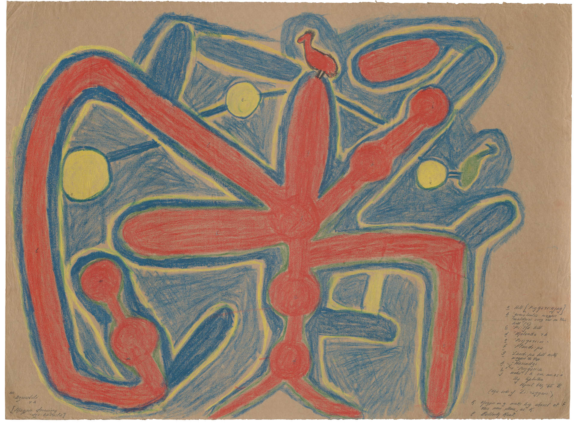 Image Splinter Dardayi Yani Jangala, Not titled (Gumurlawurru [pied butcherbird] Dreaming at Pingidijarra Hills) (detail), 1945, Birrundudu, Northern Territory, wax crayon on brown paper, Courtesy Berndt Museum, The University of Western Australia [1945/0132]
